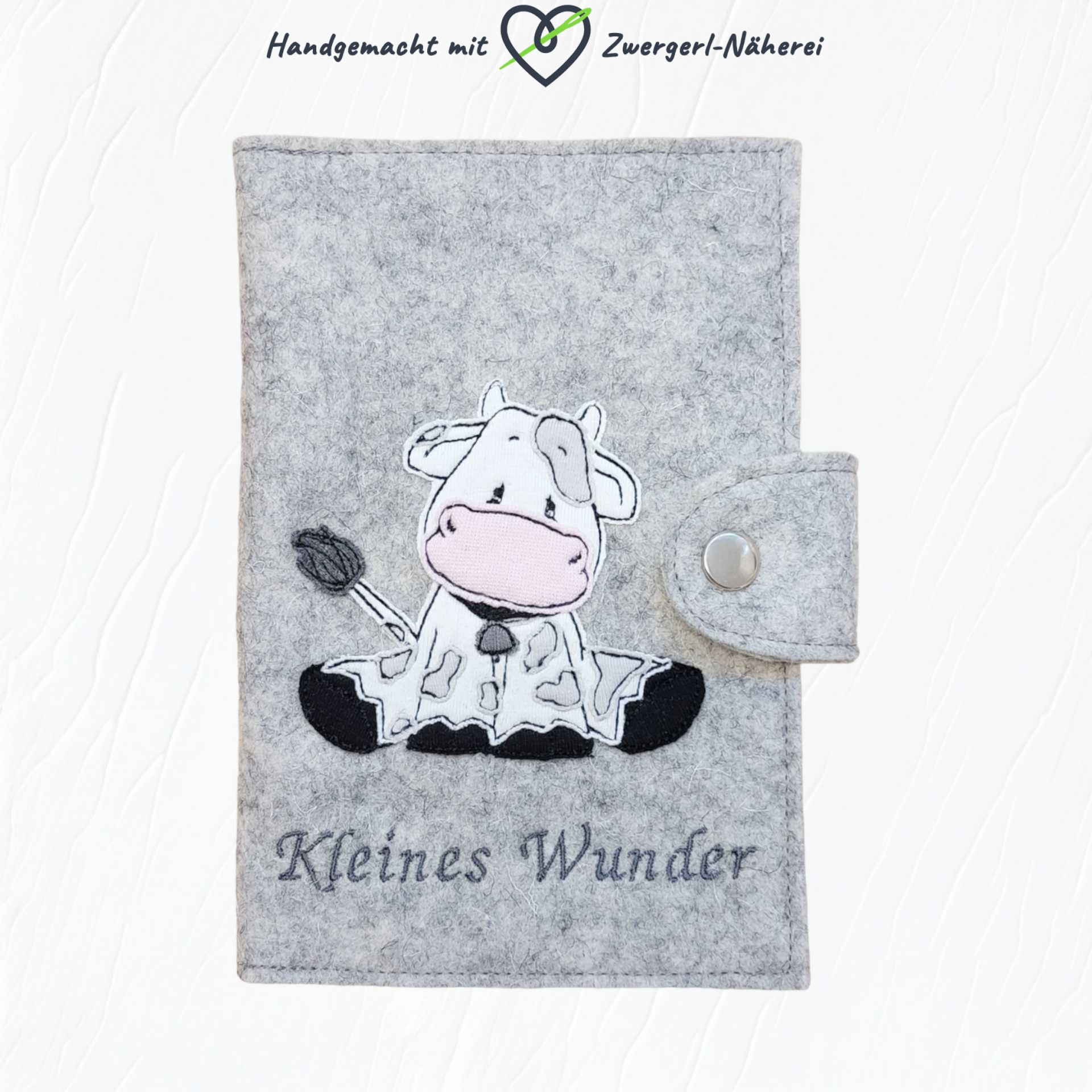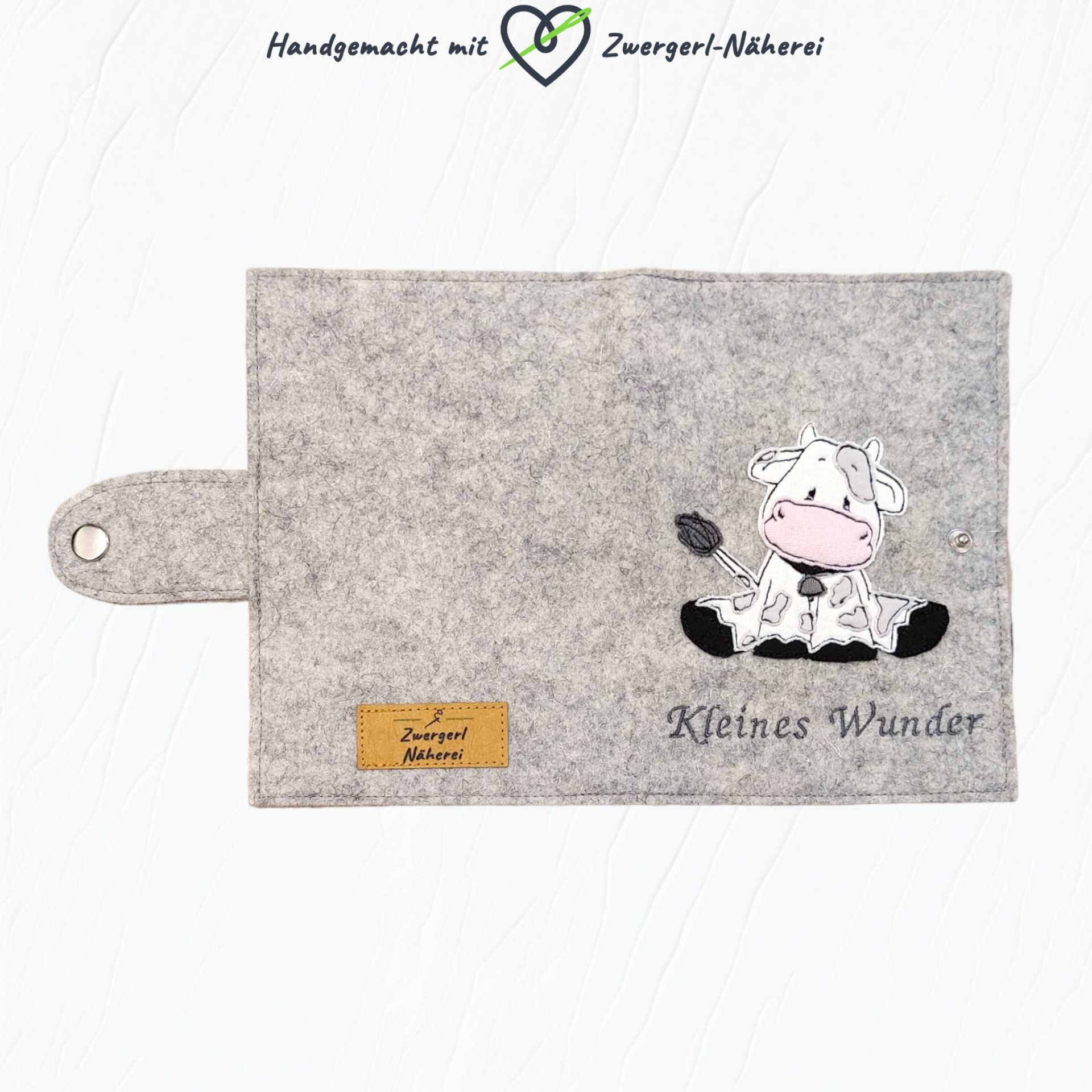 Handgemachte Mutter-Kind-Pass Hülle aus hellgrauem Bio-Wollfilz mit Kuh-Stickapplikation