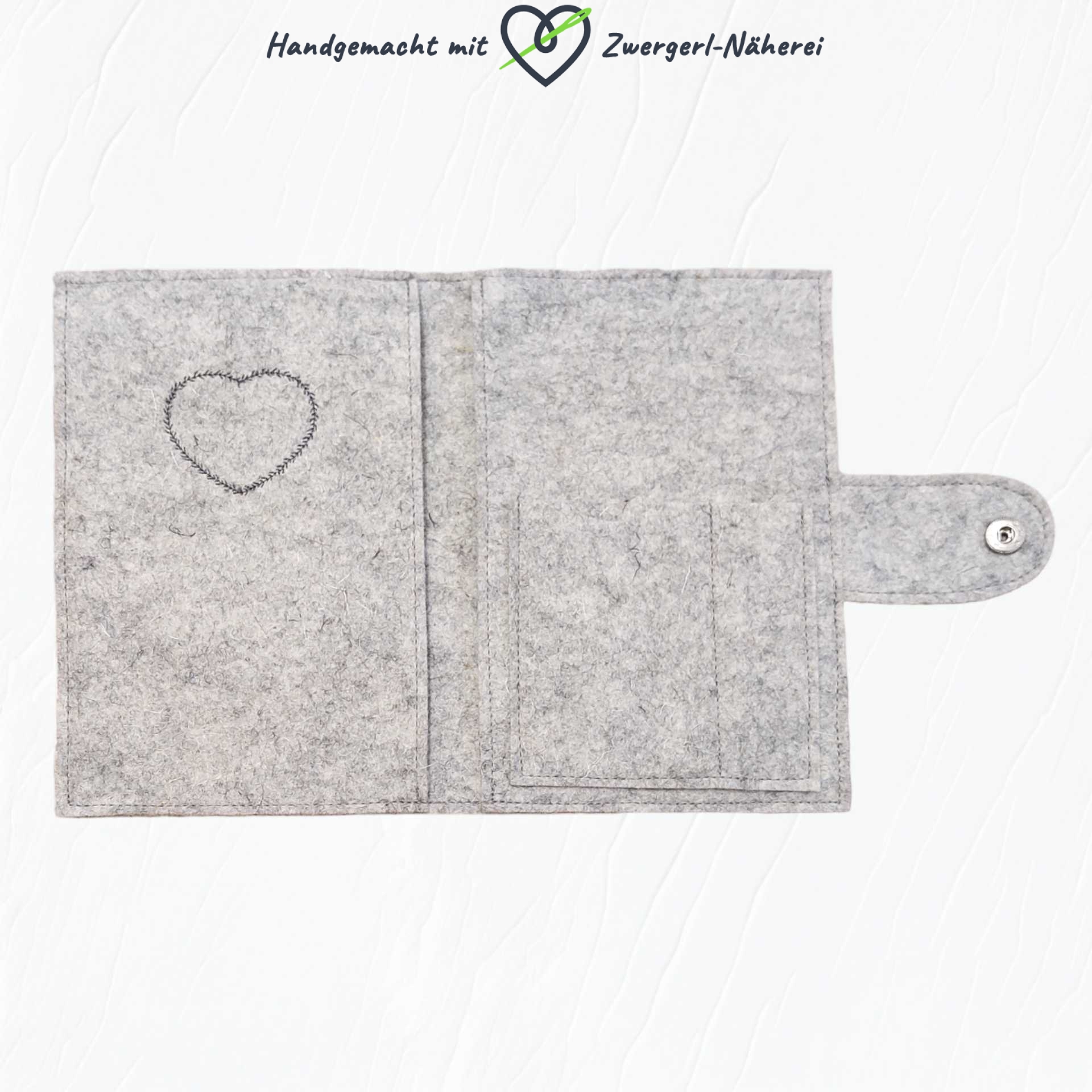 Verwendetes Material: die Mutter-Kind-Pass Hülle ist aus hochwertigem hellgrauen Bio-Filz hergestellt, 80% Bio-Merino-Wolle 20% europäische Wollsorten – Mulesing frei! Hochwertige Druckknöpfe/Kam Snaps aus einfärbigem Kunststoff oder Metall. Oeko-Tex Standard 100 zertifiziert. Da Wollfilz nach einiger Zeit Flusen bilden kann, empfehlen wir regelmäßiges Entflusen mit einem Flusenschneider, damit die Oberfläche ihr feines Aussehen behält.