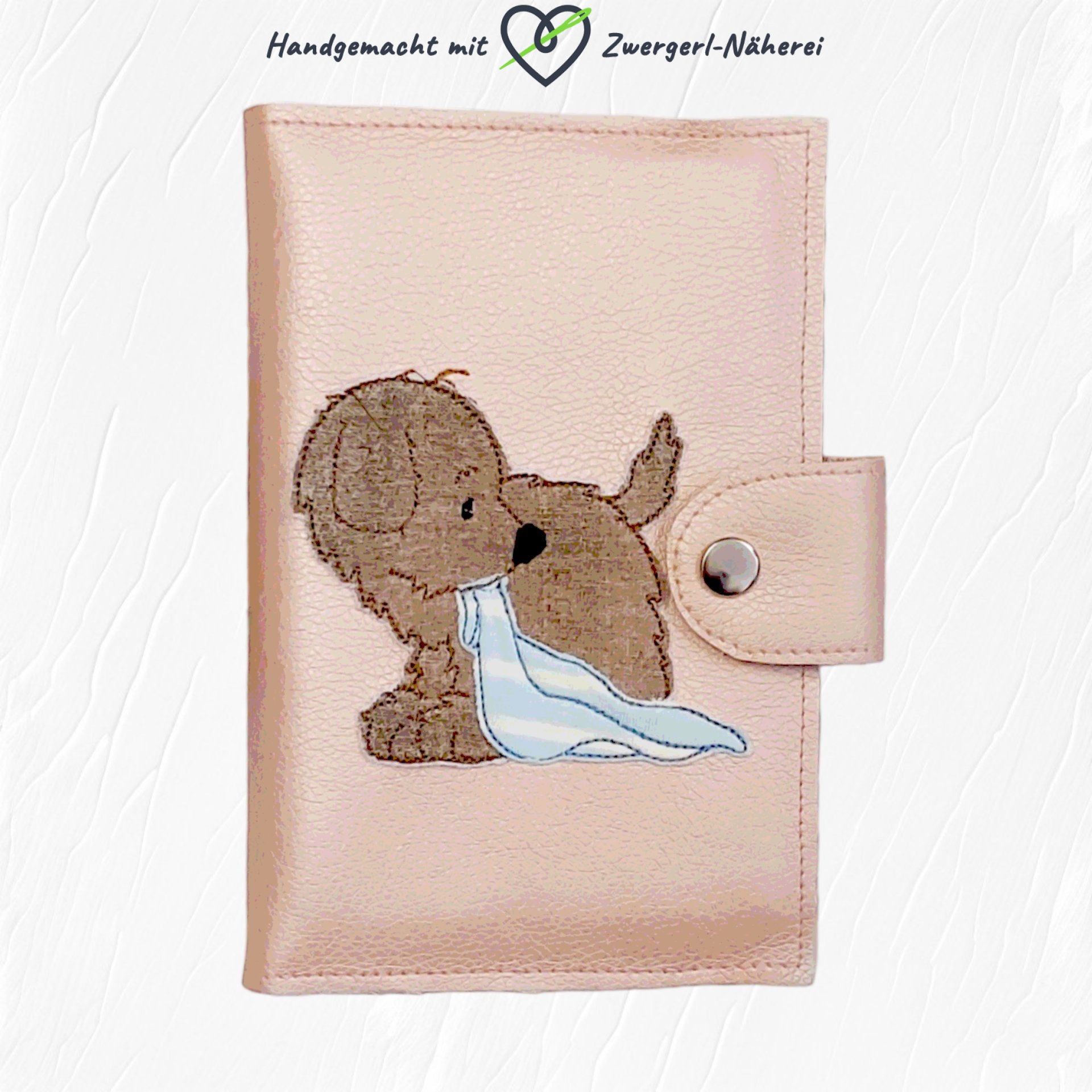 Edle Mutterkindpass-Hülle aus rosé Kunst-Leder und Stoff für den österreichischen Mutterkindpass mit süßer Hunde-Stickapplikation