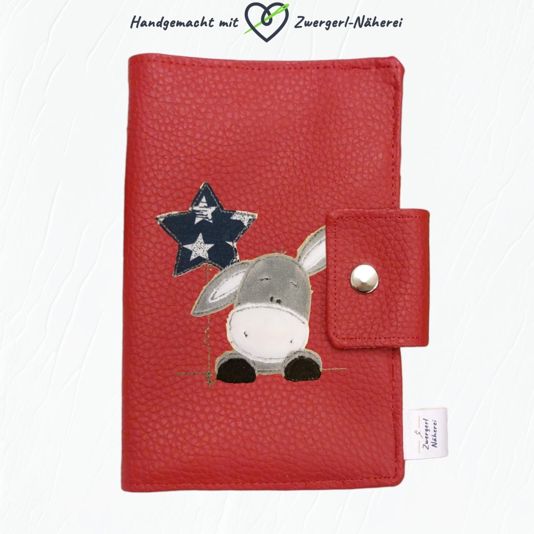 Edle Mutterkindpass-Hülle aus rotem Kunst-Leder und Stoff für den österreichischen Mutterkindpass mit Esel-Stickapplikation