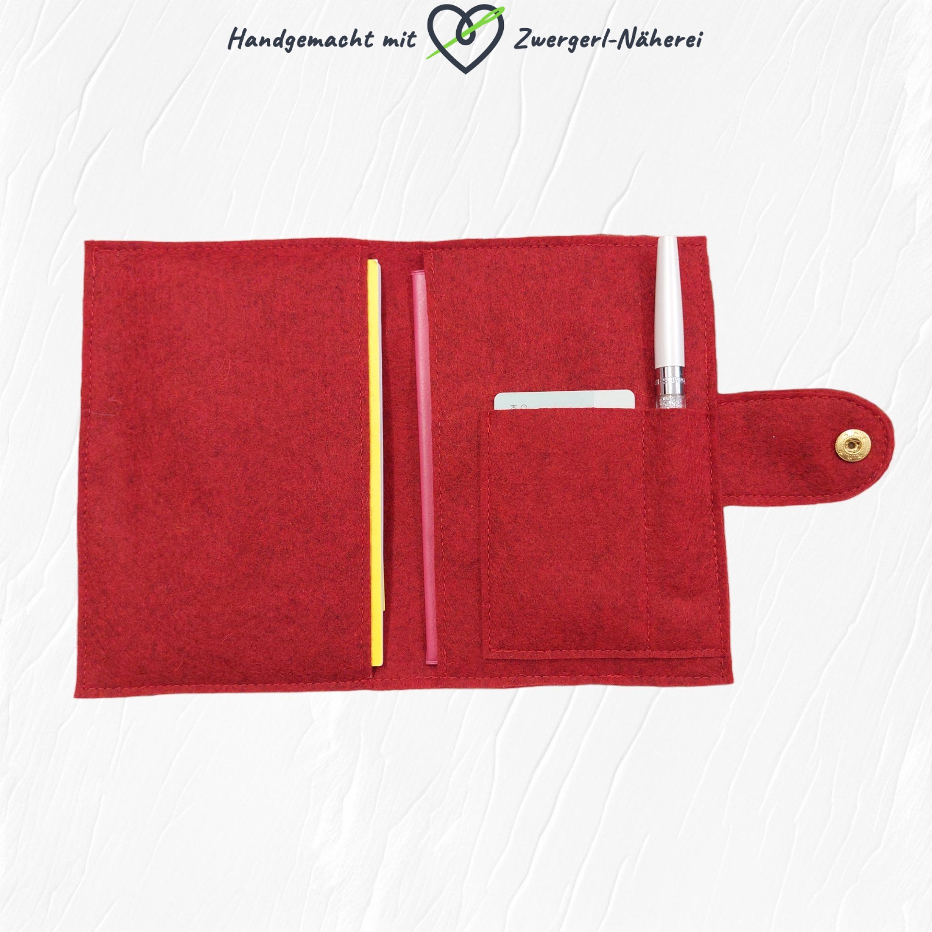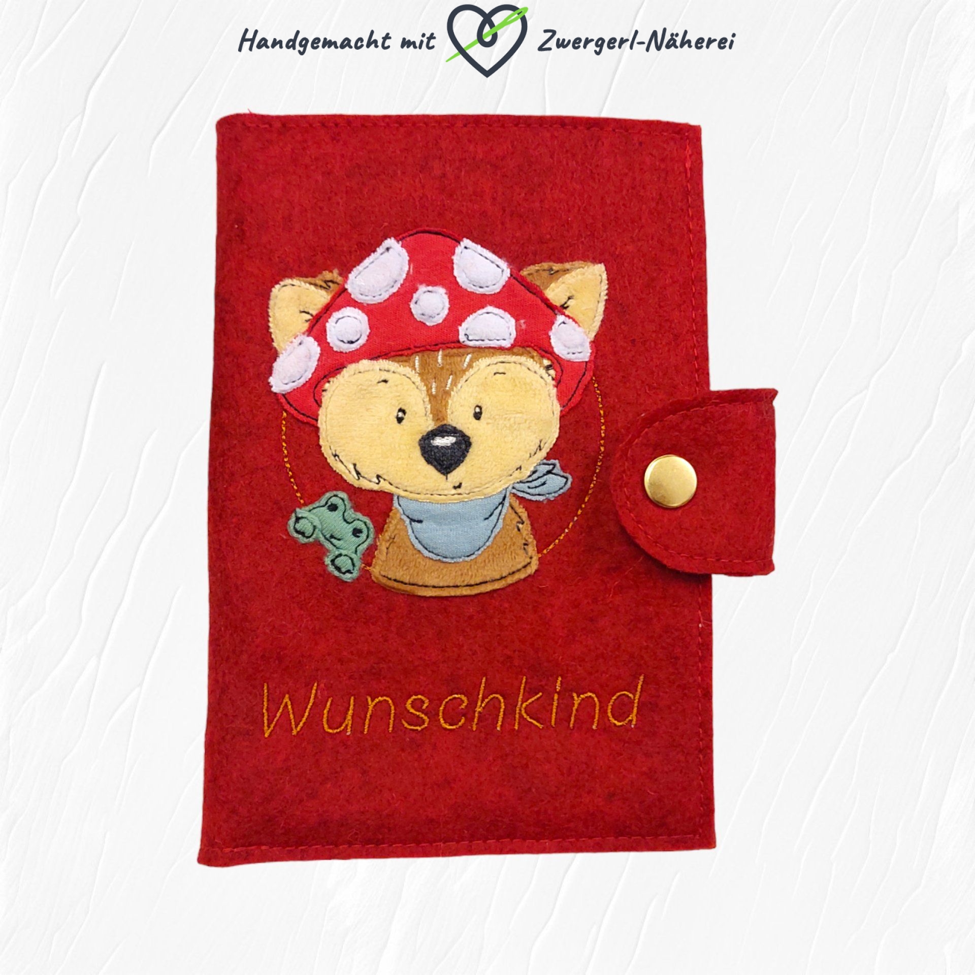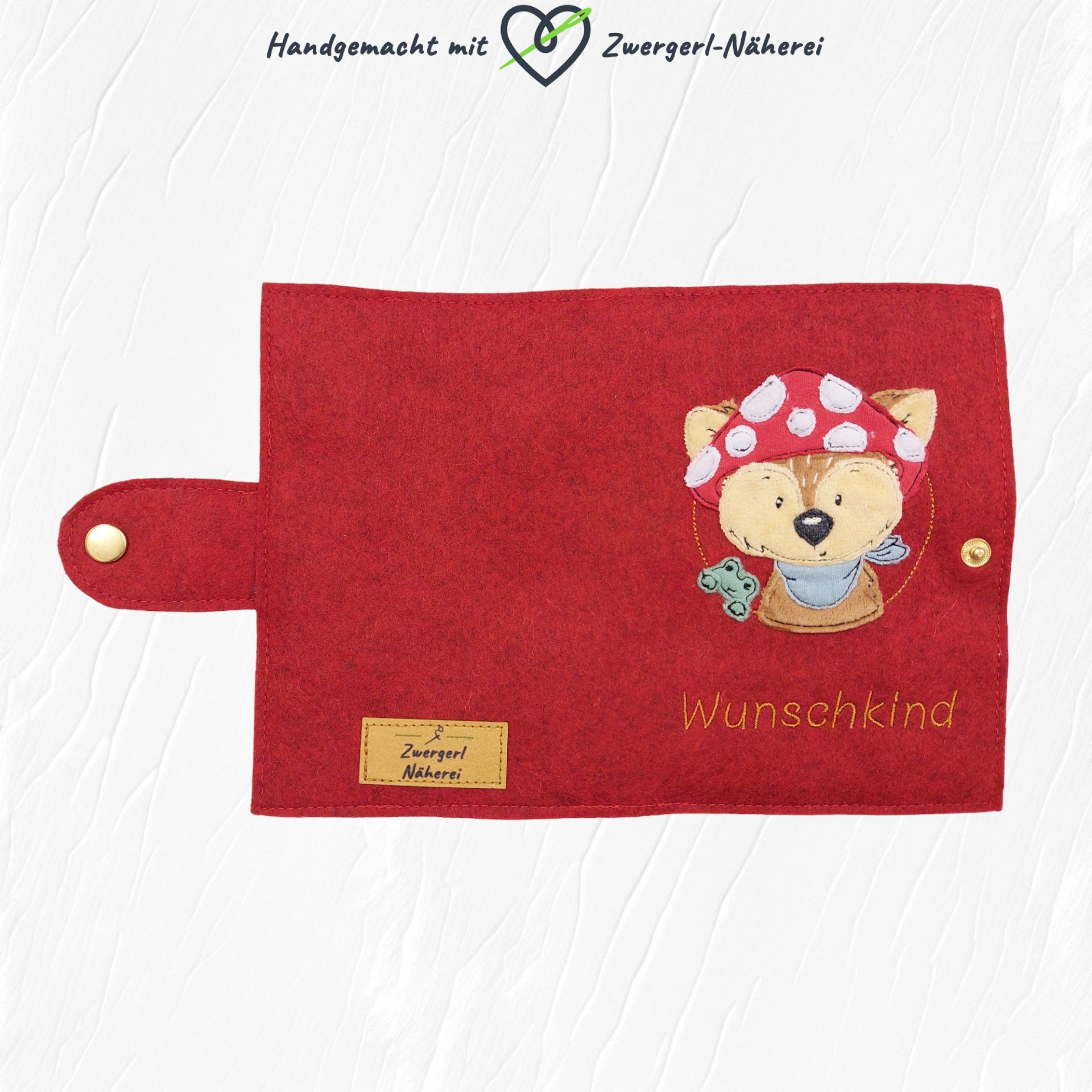 Handgemachte Mutterkindpass Hülle aus rotem Merino-Woll-Filz mit Fuchs-Stickapplikation