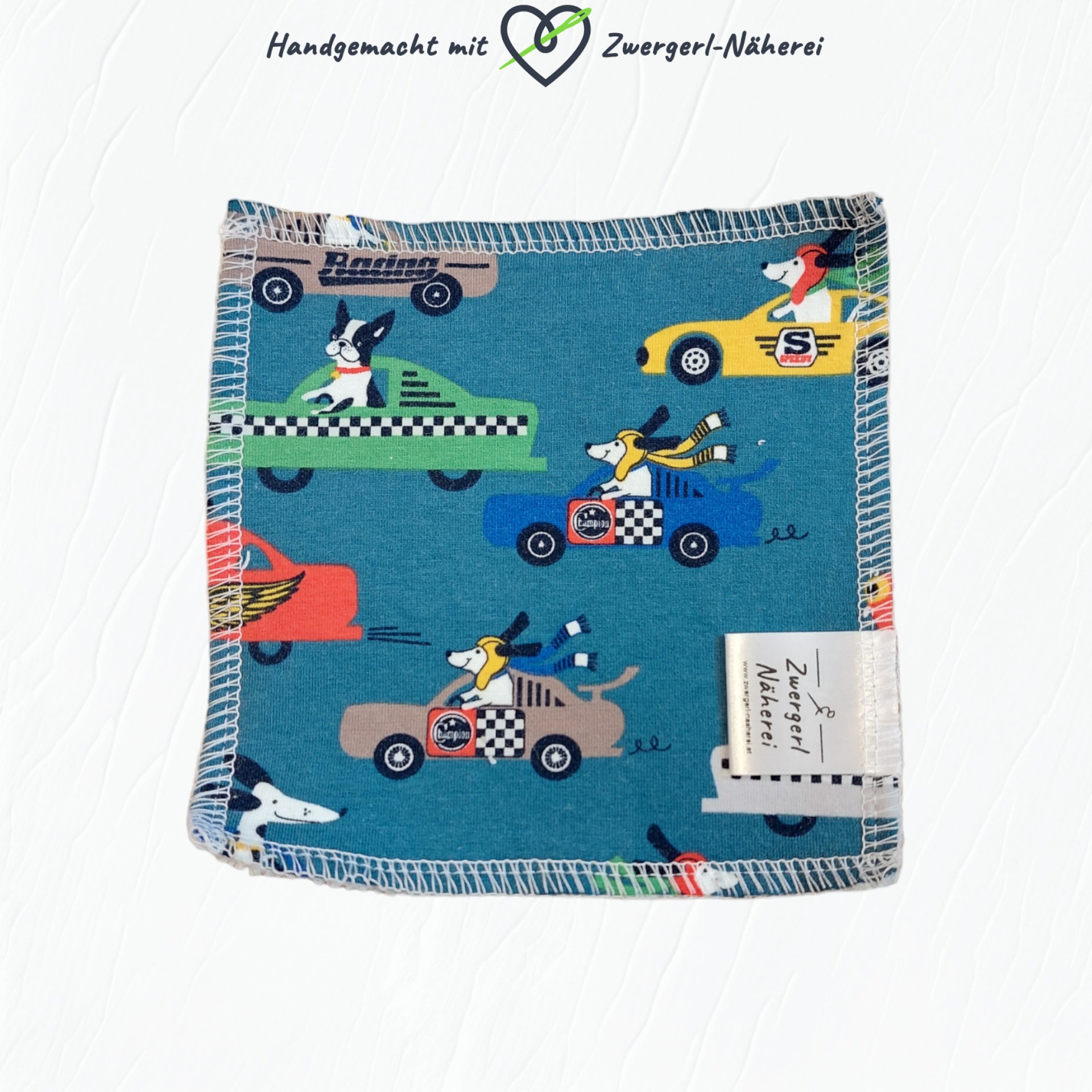 Baby-Waschtuch, Baumwoll-Reinigungstuch mit Hunde-Rennauto-Motiv in handmade Qualität