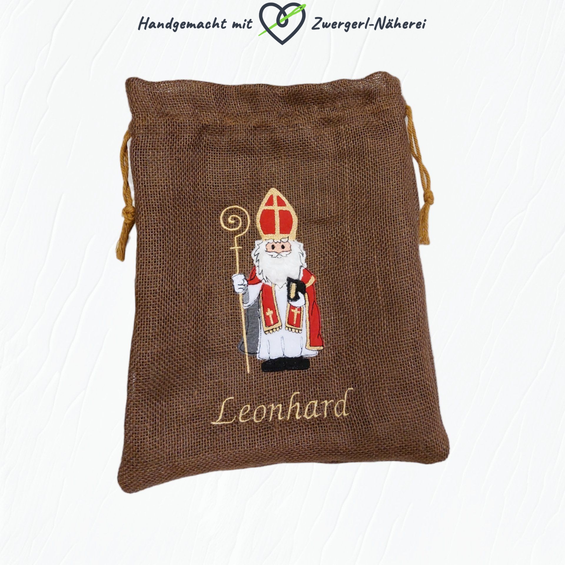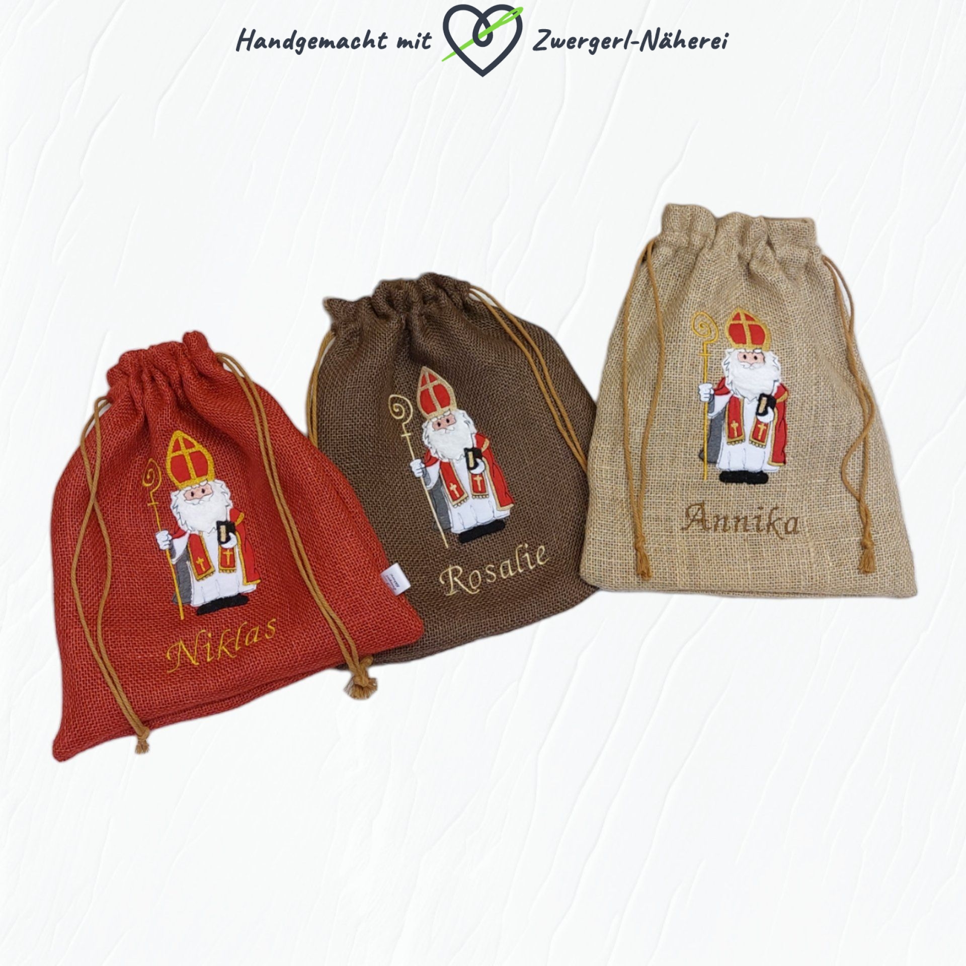 Nikolaussackerl aus Jute personalisierbar mit festlichen Farben und Motivauswahl in handmade Qualität