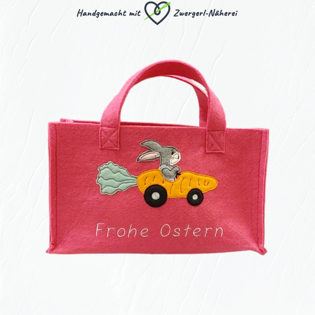 Süßes Ostertäschchen mit Hasen-Karottenauto-Motiv aus rosa Filz und dem Spruch ‚Frohe Ostern‘ bringt ein leuchten in die Augen jedes Kindes!