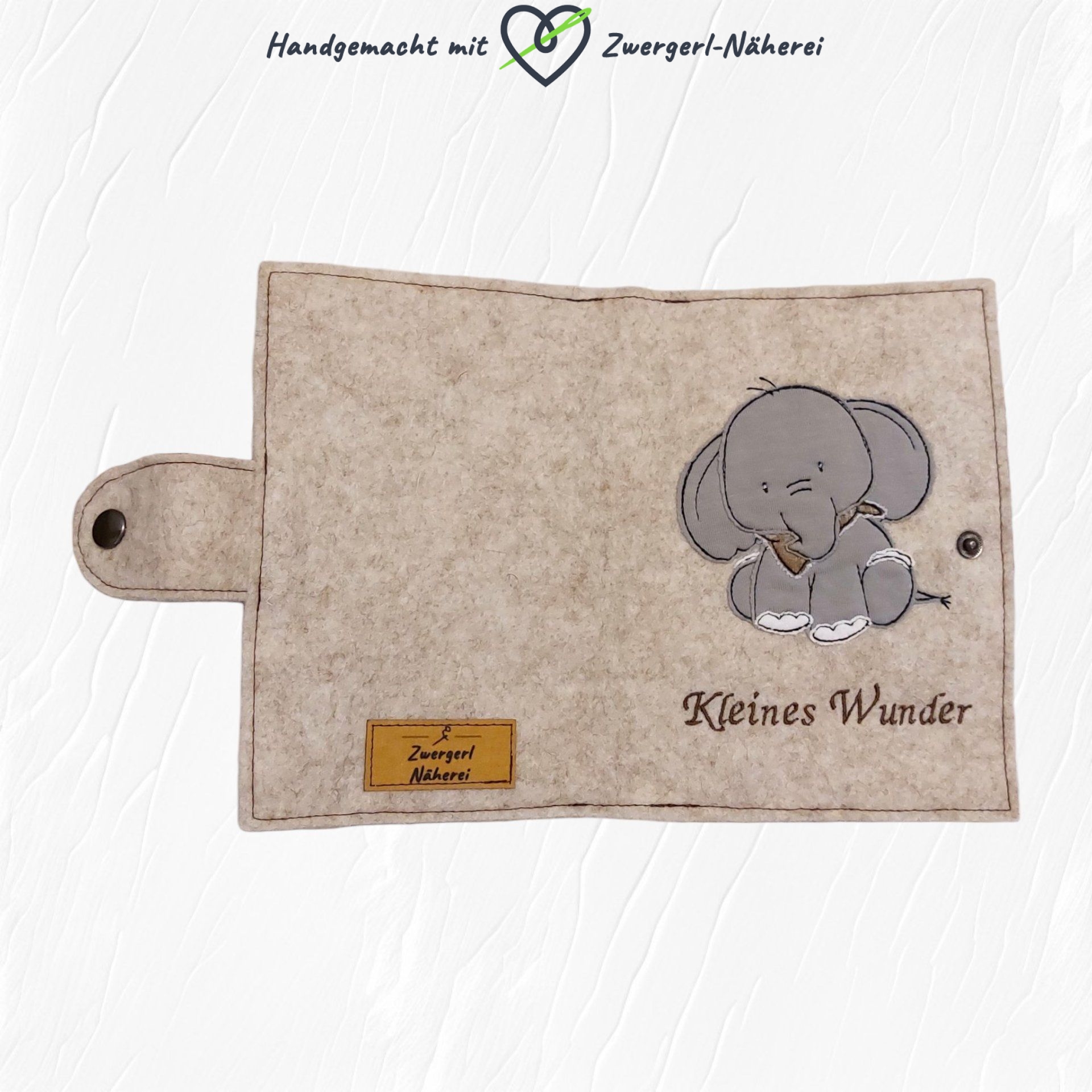 Handgenähte Mutterkindpass Hülle aus hellbeigem Filz mit Elefant-Motiv